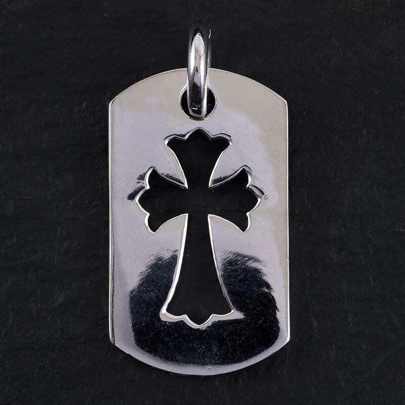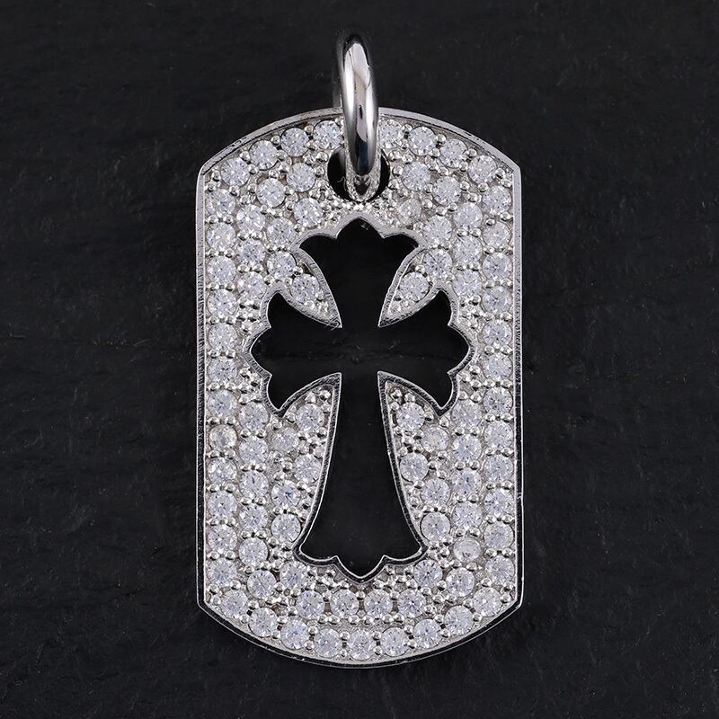 中心がクロスの形に切り抜かれたドッグタグに最高級のストーンをぎっしりと詰め込んだゴージャスなアイテムのホワイトゴールドカラー。