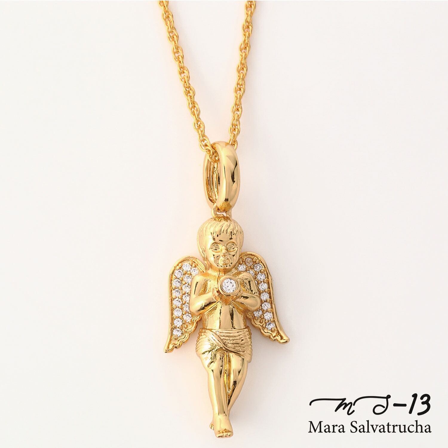 立体的に施したエンジェルモチーフのペンダントヘッド。しっかりとした装着感があります。