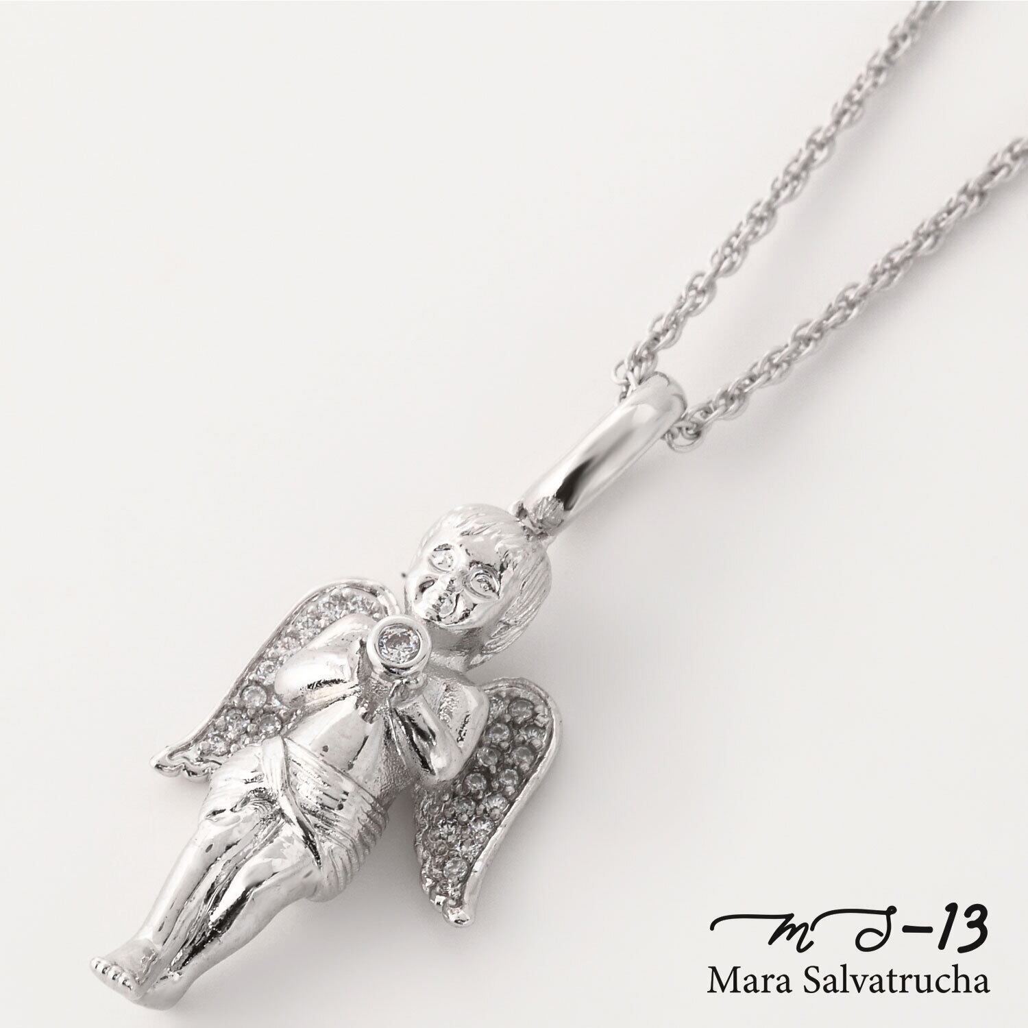 大きいサイズのチャームは手にも一粒のCZダイヤを持っているような造形。天使が授けた輝きは胸元を明るく照らします。